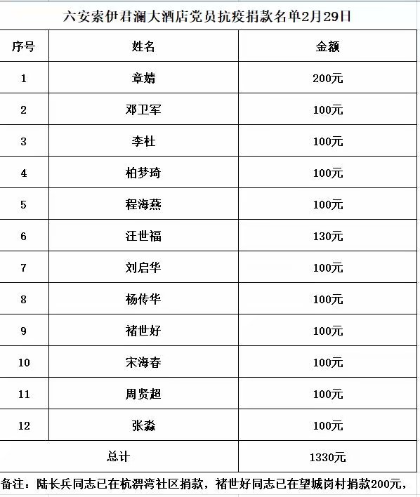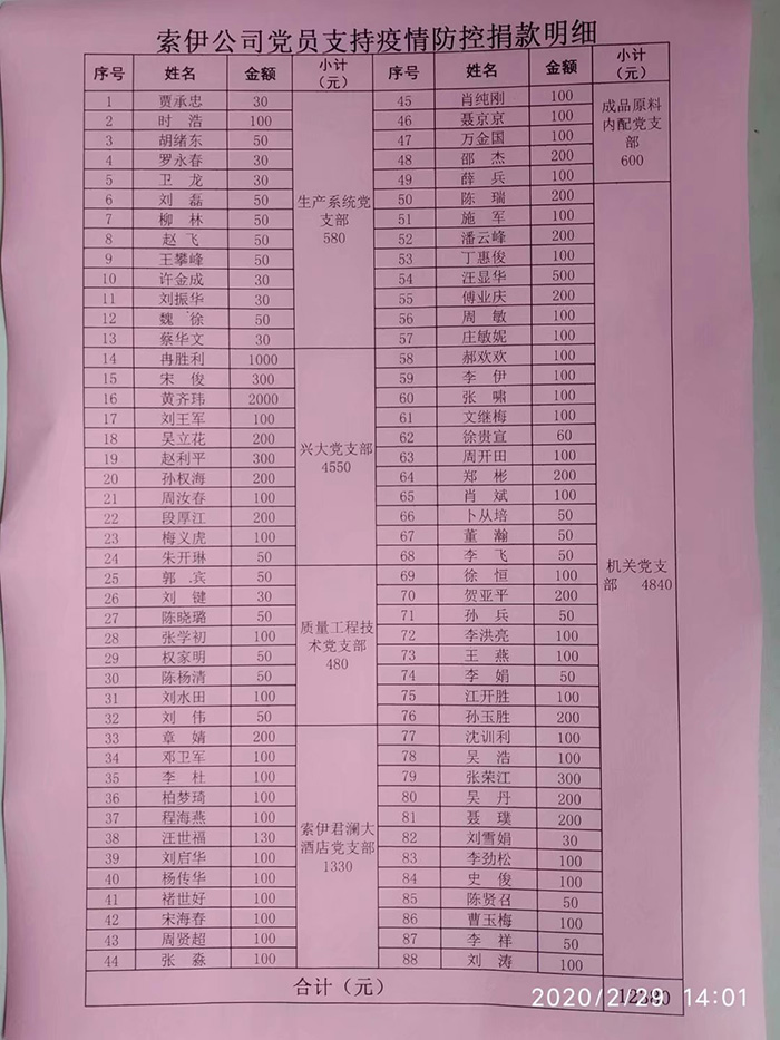 短短的半天時(shí)間,索伊廣大黨員共計(jì)捐款12380 元,其中機(jī)關(guān)黨支部捐款4840元,生產(chǎn)系統(tǒng)黨支部捐款580元,成品內(nèi)配原料黨支部600元,質(zhì)量工程技術(shù)黨支部捐款480元,興大公司黨支部4450元,索伊君瀾黨支部捐款1330元。一份份捐款帶著濃厚的情誼,一句句話語閃爍著黨性的光輝,匯聚成了索伊人的大愛無疆,形成了眾志成城抗擊疫情的濃厚氛圍,武漢,加油!中國,加油!沒有一個(gè)冬天不可逾越,也沒有一個(gè)春天不會(huì)到來!