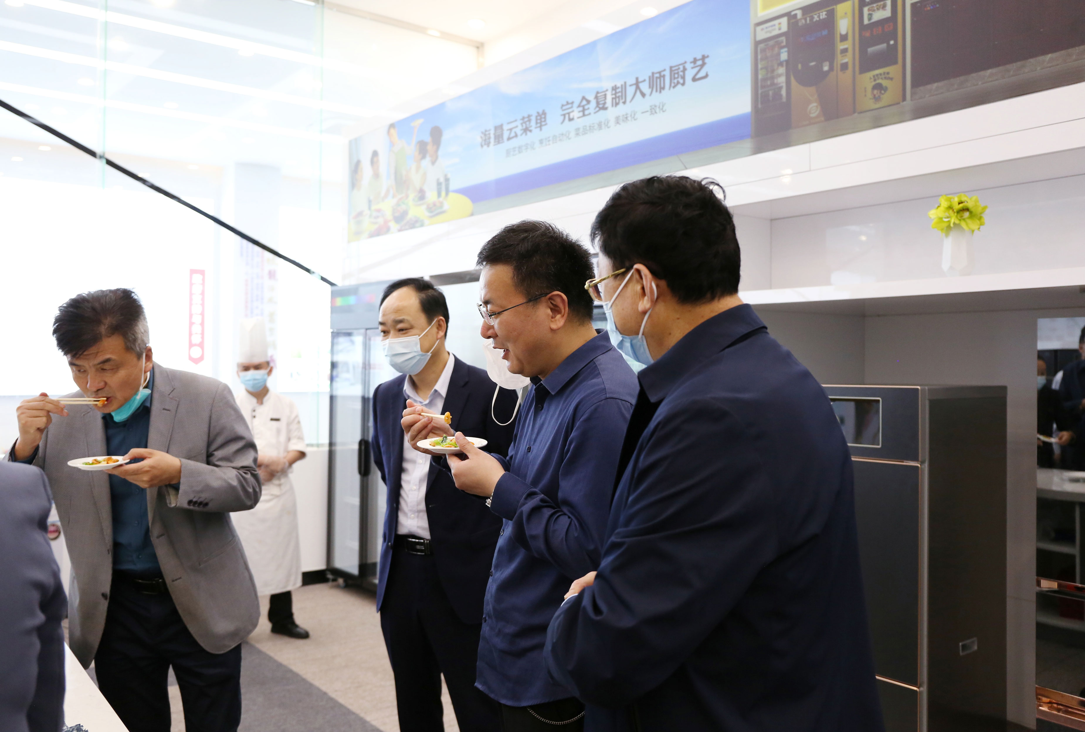 接著,黃院長(zhǎng)一行又來(lái)到公司的產(chǎn)品展示廳和轉(zhuǎn)型展示廳。集團(tuán)公司董事長(zhǎng)助理倪曙東向黃院長(zhǎng)一行重點(diǎn)介紹了索伊集團(tuán)的發(fā)展歷程。他聽(tīng)后對(duì)索伊創(chuàng)新發(fā)展的路徑大為贊賞,對(duì)精準(zhǔn)總結(jié)智能制造餐飲行業(yè)發(fā)展“八化”趨勢(shì)給予充分肯定。在中央廚房的體驗(yàn)廳,現(xiàn)場(chǎng)觀看了無(wú)油煙、無(wú)明火、無(wú)污染、快捷環(huán)保的廚神和野牛機(jī)器人分別炒制的蔥爆河蝦和黑椒牛肉粒炒制過(guò)程。當(dāng)黃院長(zhǎng)一行品嘗菜品后更是贊不絕口,他深有感觸地說(shuō):“色香味俱全,口感很好,肉嫩細(xì)滑、咸淡精確適宜,很好吃?!边@臺(tái)野牛炒菜機(jī)器人,值得在學(xué)校食堂推廣使用,我希望以后我們有合作的機(jī)會(huì)?!?/span>