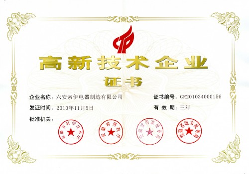 ——熱烈祝賀六安索伊電器榮獲“安徽省2010年高新技術(shù)企業(yè)”榮譽稱號