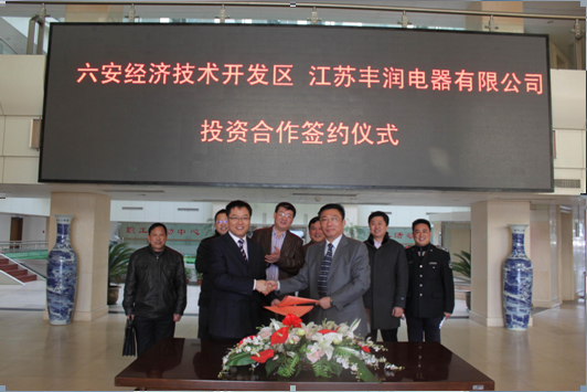 12月20日,江蘇豐潤電器有限公司與六安經(jīng)濟(jì)開發(fā)區(qū)簽約,投資建設(shè)六安豐潤電器有限公司。該項(xiàng)目為索伊電器招商引進(jìn),占地約100畝,項(xiàng)目總投資 1.5億元,其中固定資產(chǎn)投資不低于1.2億元,項(xiàng)目計(jì)劃2011年5月開工建設(shè),2013年5月正式投產(chǎn)。整個(gè)項(xiàng)目建成后年產(chǎn)值達(dá)3億元,年入庫稅金不低于800萬元。