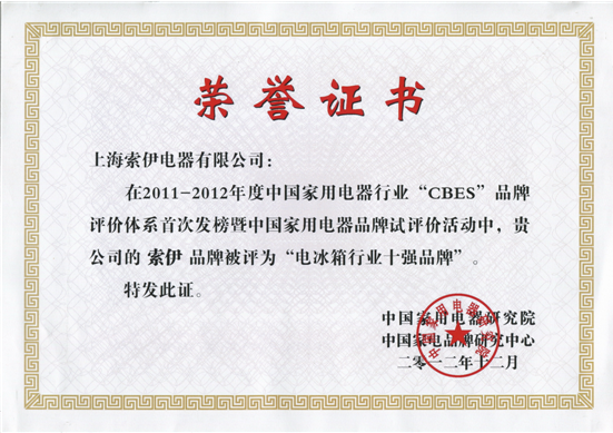 2011-2012年度中國(guó)家用電器行業(yè)“CBES”品牌評(píng)價(jià)體系首次發(fā)榜暨中國(guó)家用電器品牌試評(píng)價(jià)活動(dòng)結(jié)果在北京發(fā)布,索伊冰箱從眾多參選品牌中脫穎而出,一舉奪獲“中國(guó)電冰箱行業(yè)十強(qiáng)品牌”的榮譽(yù)稱(chēng)號(hào)。
