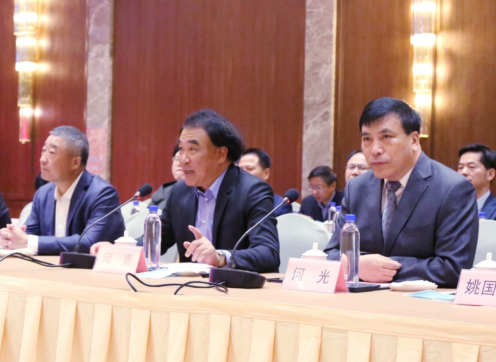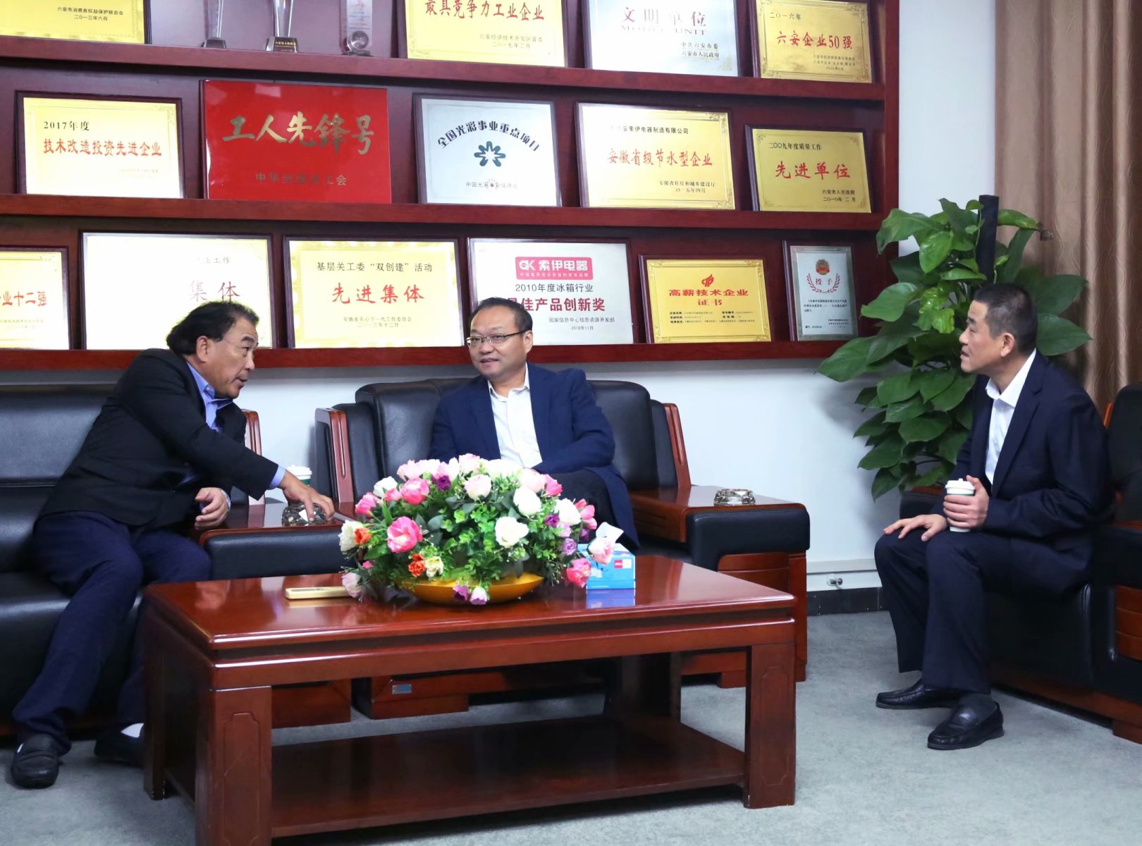 會(huì)前副市長(zhǎng)束學(xué)龍與上海愛(ài)餐機(jī)器人有限公司創(chuàng)始人、董事長(zhǎng)何青、安徽索伊集團(tuán)董事長(zhǎng)王瓊峰交流。