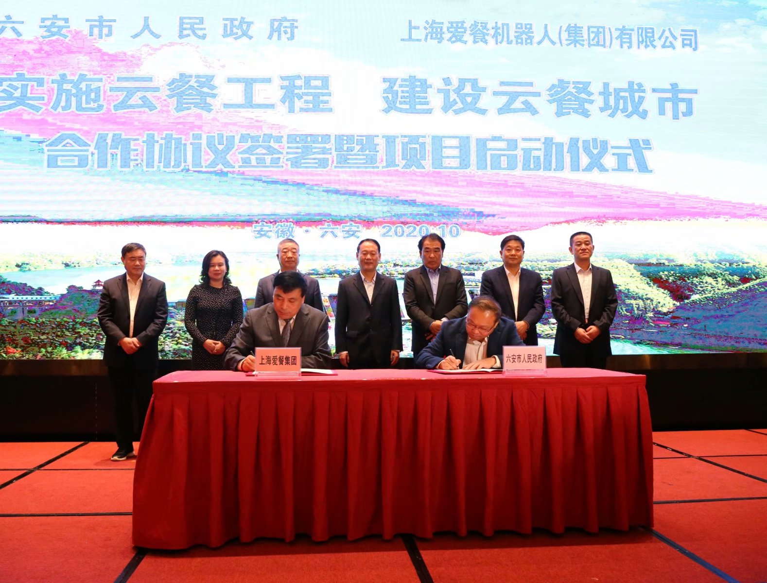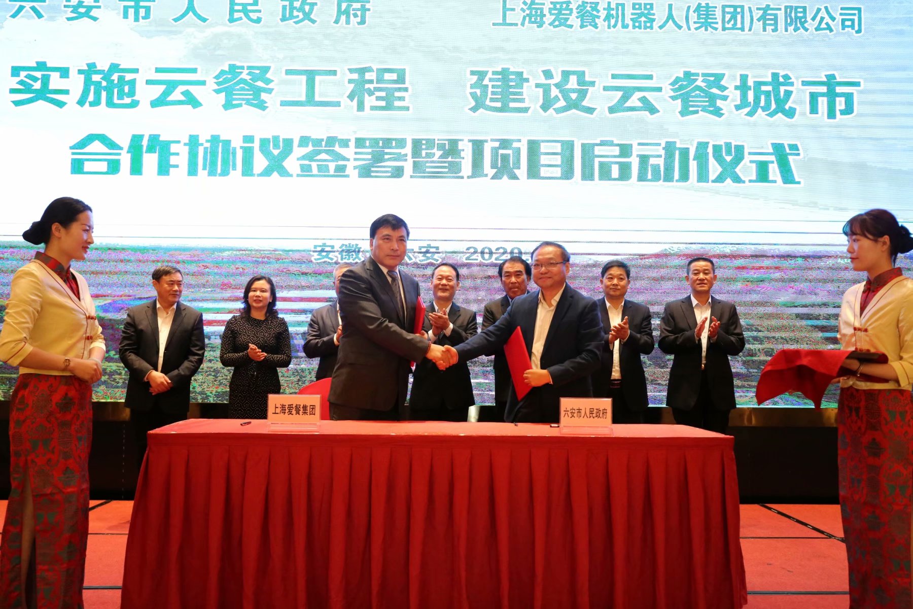 六安市人民政府副市長(zhǎng)束學(xué)龍與上海愛(ài)餐機(jī)器人有限公司總裁何光共同簽署合作協(xié)議,市委副書(shū)記、市長(zhǎng)葉露中、愛(ài)餐機(jī)器人創(chuàng)始人、董事長(zhǎng)何青、六安開(kāi)發(fā)區(qū)管委會(huì)主任盧俊、上海愛(ài)餐機(jī)人公司董事何志光、總裁辦主姚國(guó)冠、六安市人民政府秘書(shū)長(zhǎng)陸純、安徽索伊集團(tuán)董事長(zhǎng)王瓊峰見(jiàn)證簽約儀式