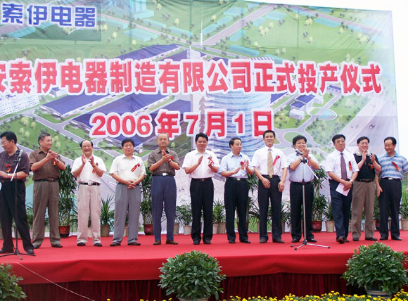 2006年7月1日,六安索伊電器制造有限公司第一條年產(chǎn)30萬臺電冰箱生產(chǎn)線建成投產(chǎn)。市領(lǐng)導倪發(fā)科、湯林祥、程世龍、汪永義、潘忠余、楊光祥、趙懷華等出席儀式。市委書記、市人大常委會主任倪發(fā)科、市長湯林祥為第一臺六安生產(chǎn)的索伊電冰箱下線剪彩。