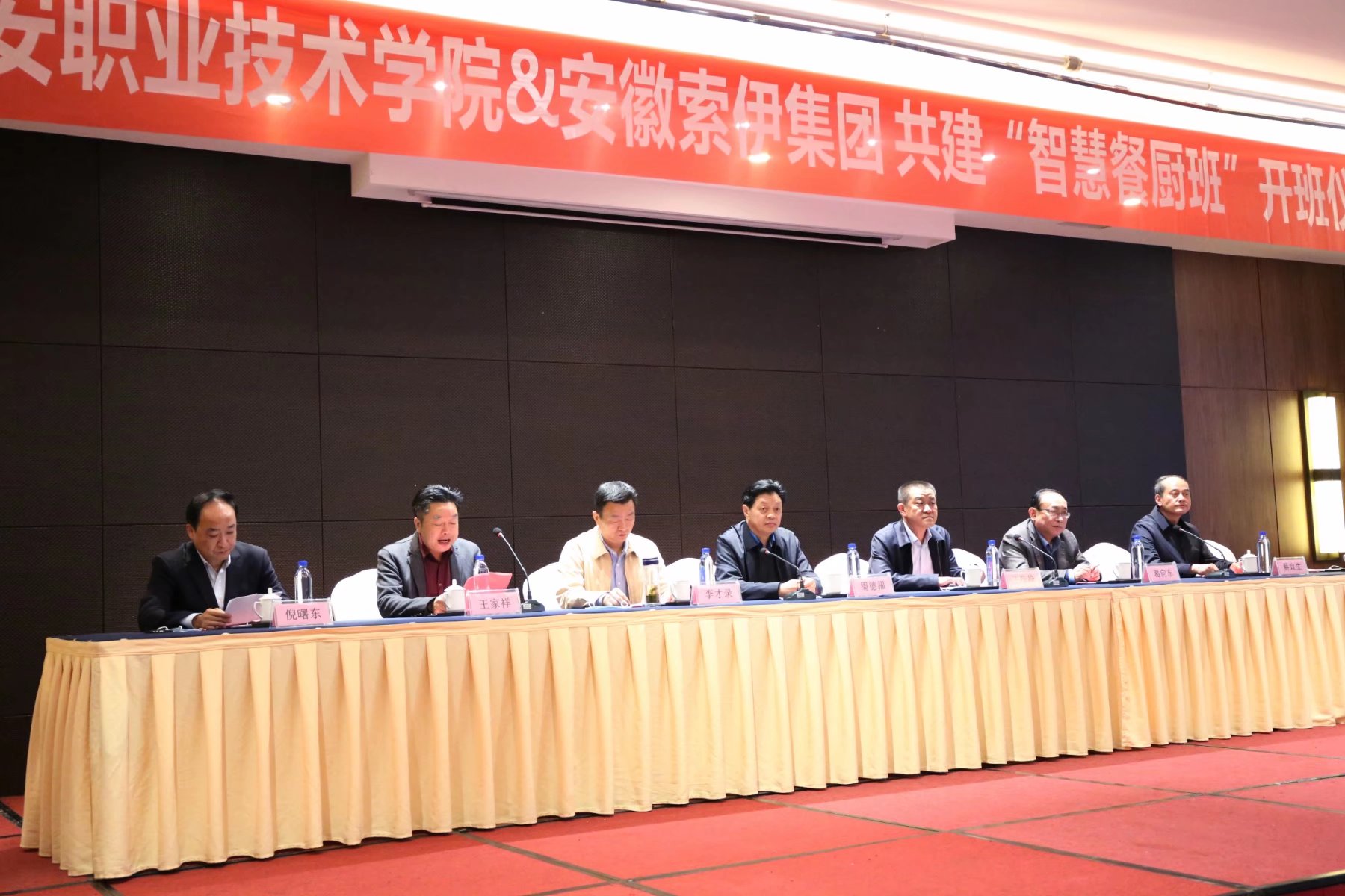 2021年11月5日下午四點(diǎn),六安職業(yè)技術(shù)學(xué)院與安徽索伊集團(tuán)共建“智慧餐廚”班開班儀式在六安索伊君瀾大酒店隆重舉行,六安職業(yè)技術(shù)學(xué)院黨委書記周德福,黨委副書記、院長葛向東,黨委委員、副院長王家祥,安徽索伊集團(tuán)董事長王瓊峰,董事長助理倪曙東,黨委書記汪顯華參加了開班儀式,市經(jīng)信局黨組成員、副局長李才錄、市人力資源保障局四級(jí)調(diào)研員蔡宜生應(yīng)邀到會(huì),以及智慧餐廚班的51位學(xué)生及老師共同參加了開班儀式。
