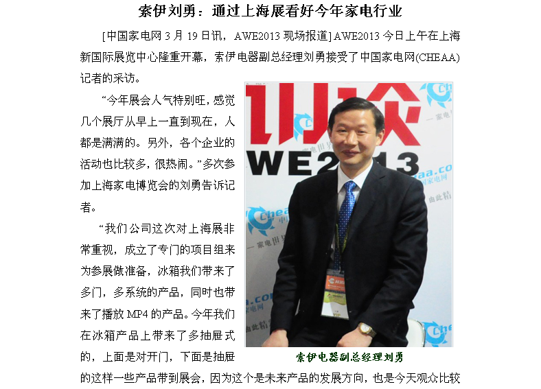 索伊劉勇:通過上海展看好今年家電行業(yè) 日期:2013/7/5? 上一篇:金龍舞盛世 銀蛇喚新春 2013/7/5下一篇:索伊電器董事長王瓊峰榮獲安徽省“十佳環(huán)保人士”榮譽稱號 2013/7/6