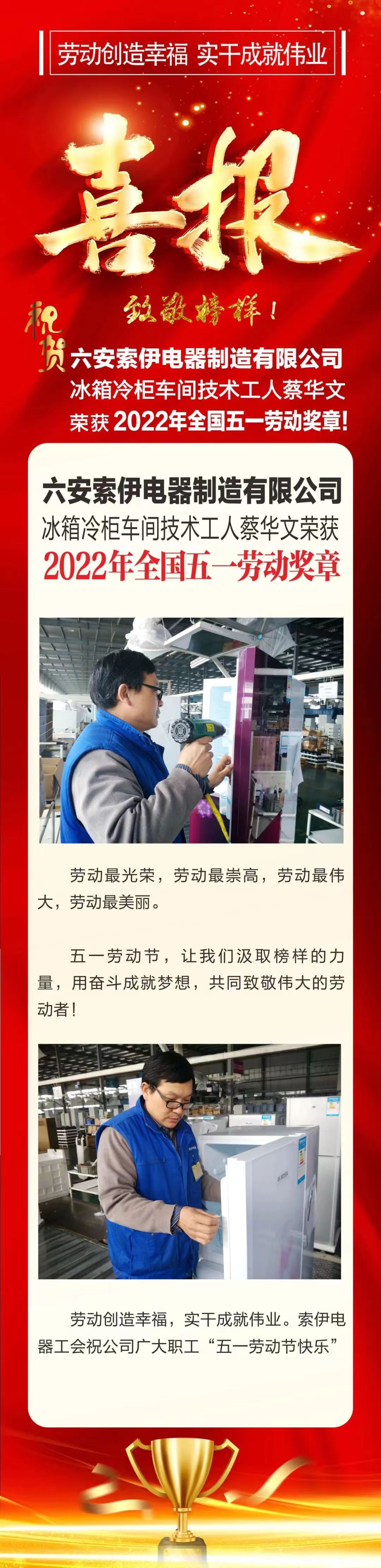 喜報:六安索伊電器制造有限公司冰箱冷柜車間技術(shù)工人蔡華文榮獲2022年全國五一勞動獎?wù)拢?/h3>